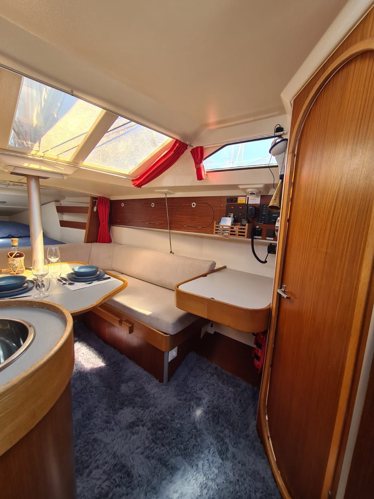 Auf Steuerbordseite liegt der Navi-Tisch mit UKW Funkgerät, Seekarten, Navigationsbesteck, Elektro- Schalt- Panel, Rettungsmitteln, etc.