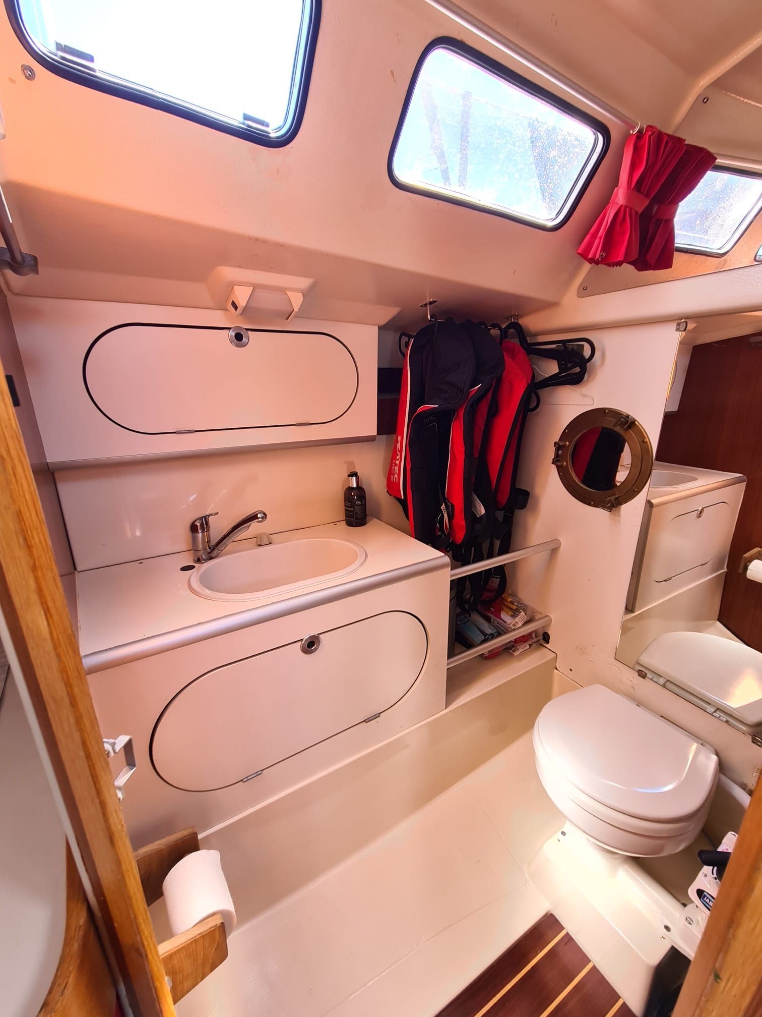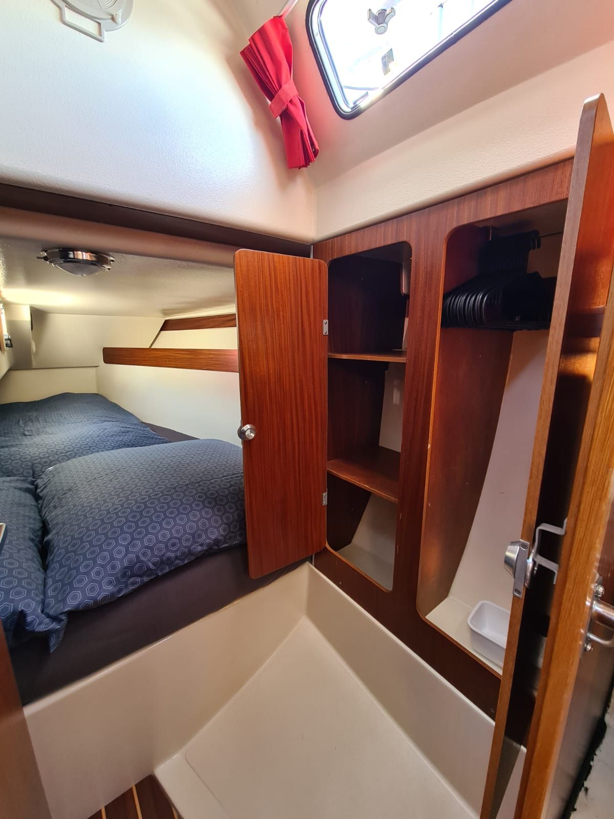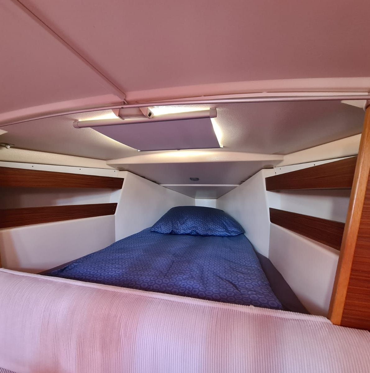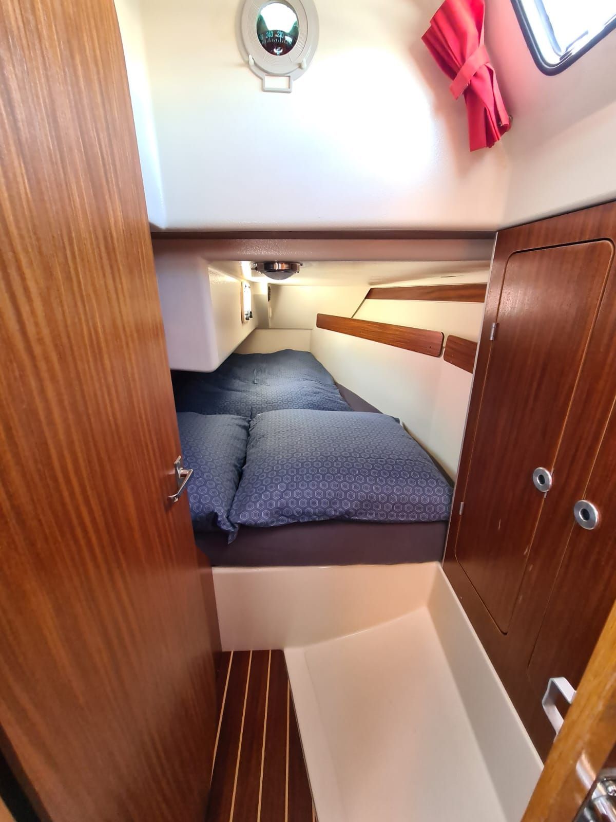 Im Vorschiff befindet sich eine Koje, die für einen Erwachsenen oder alternativ für 2 Kinder ausreichend Schlafplatz mitbringt, so dass hier sehr erholsam auf der "echten" Matratze geschlafen werden kann. (Ich selber bin 1,90m und habe dort dutzende Male sehr gut geschlafen).