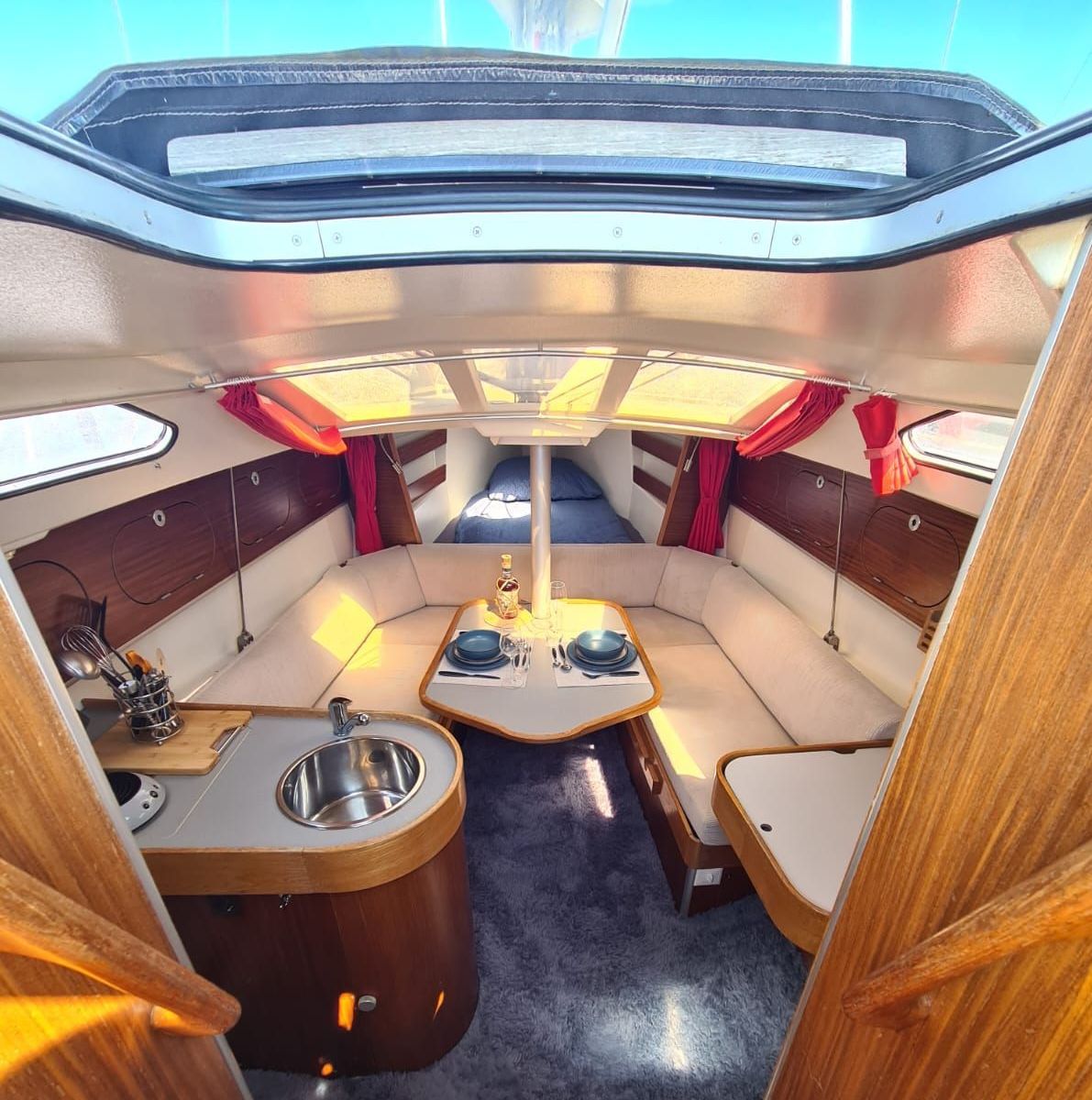 Direkt an die Bugkoje ist der Salon mit Rundecke inkl. absenkbarem Tisch angeschlossen. Hier finden 4-6 Personen ausreichend Platz, um gemütlich zusammenzusitzen.