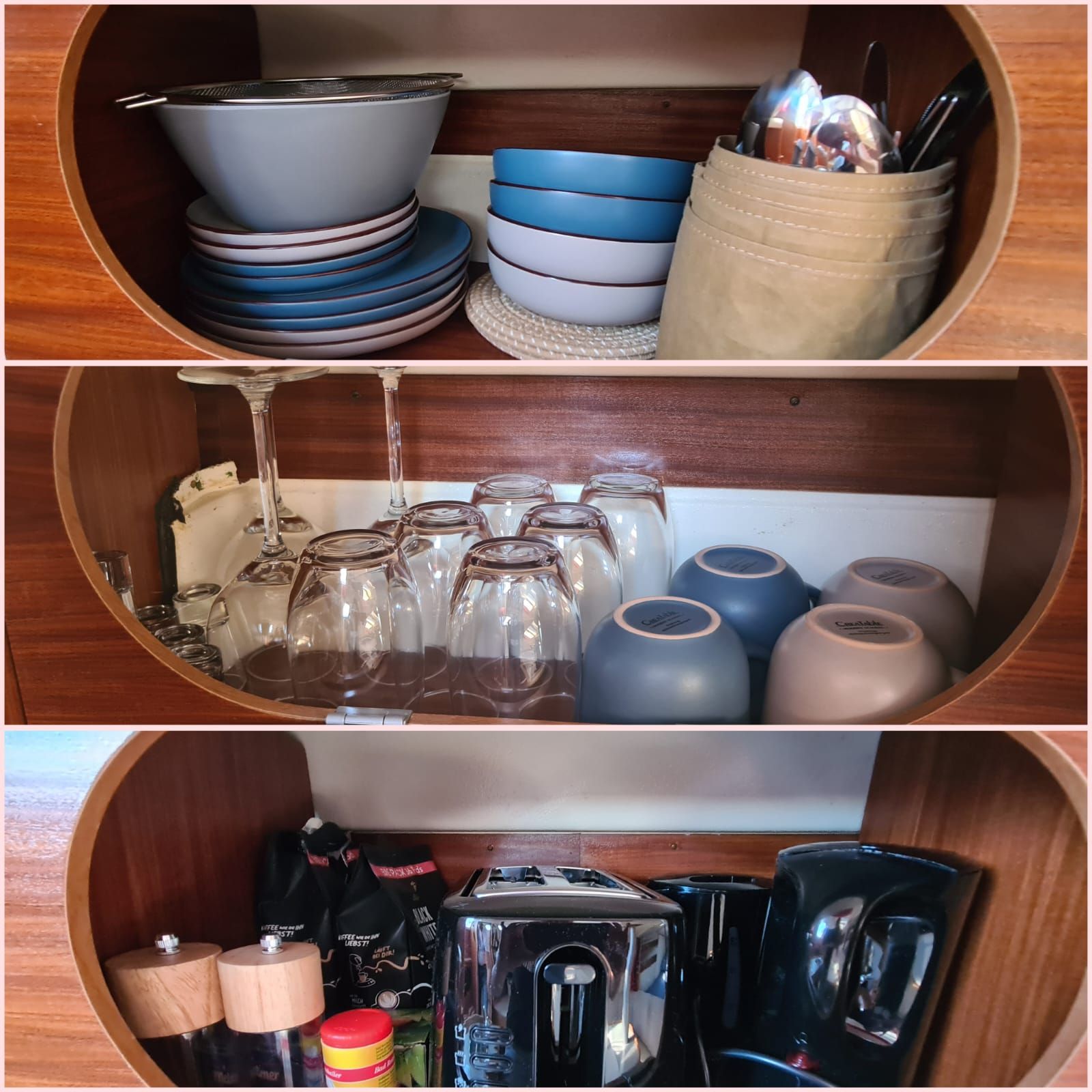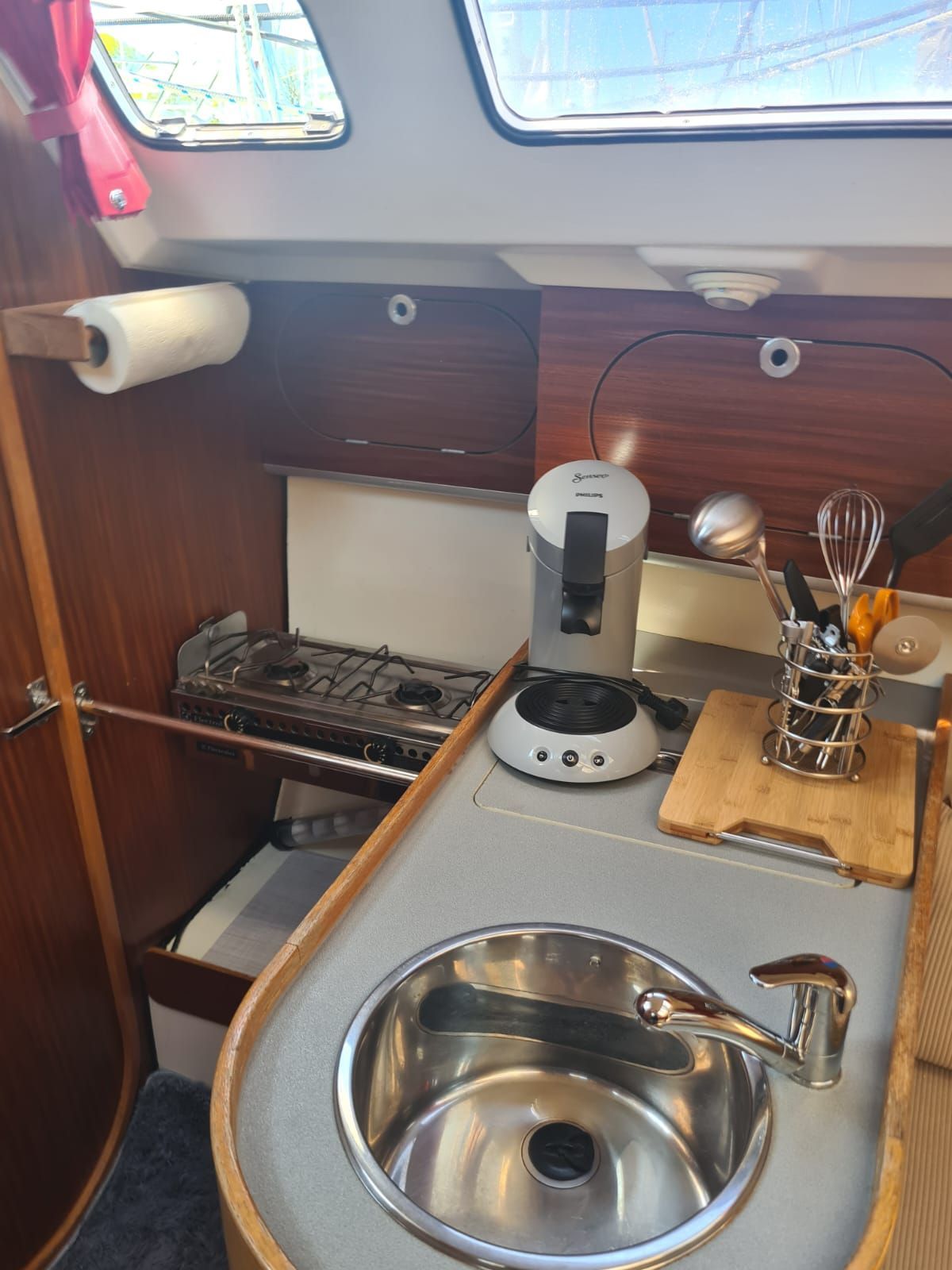 Begrenzt wird die Rundecke auf Backbordseite durch die offene Küche, welche mit allen notwendigen Küchengerätschaften ausgerüstet ist. U.a. sind hier Kaffeemaschine, Toaster, Wasserkocher, Elektro- Backofen, usw. vorhanden.
